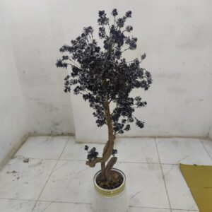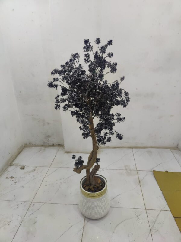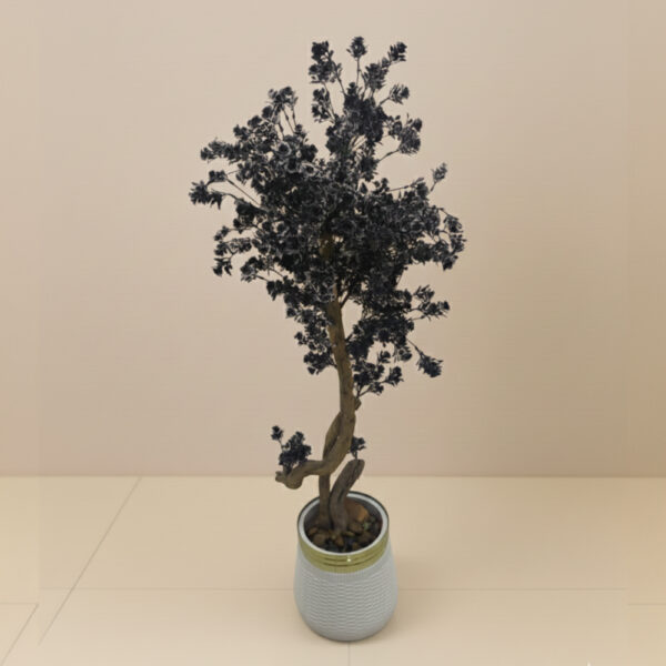 A striking artificial tree featuring unique black foliage and a realistic twisted trunk. This maintenance-free statement piece comes pre-set in a textured white and gold designer pot, making it ready to display immediately in any modern home or office.