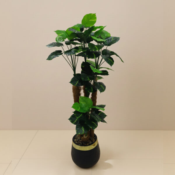 Bring a touch of nature indoors without the upkeep. This lifelike artificial Pothos plant features lush, green variegated leaves climbing a natural-look pole. It comes pre-potted in a modern black and gold planter, making it a ready-to-display accent for any home or office corner.